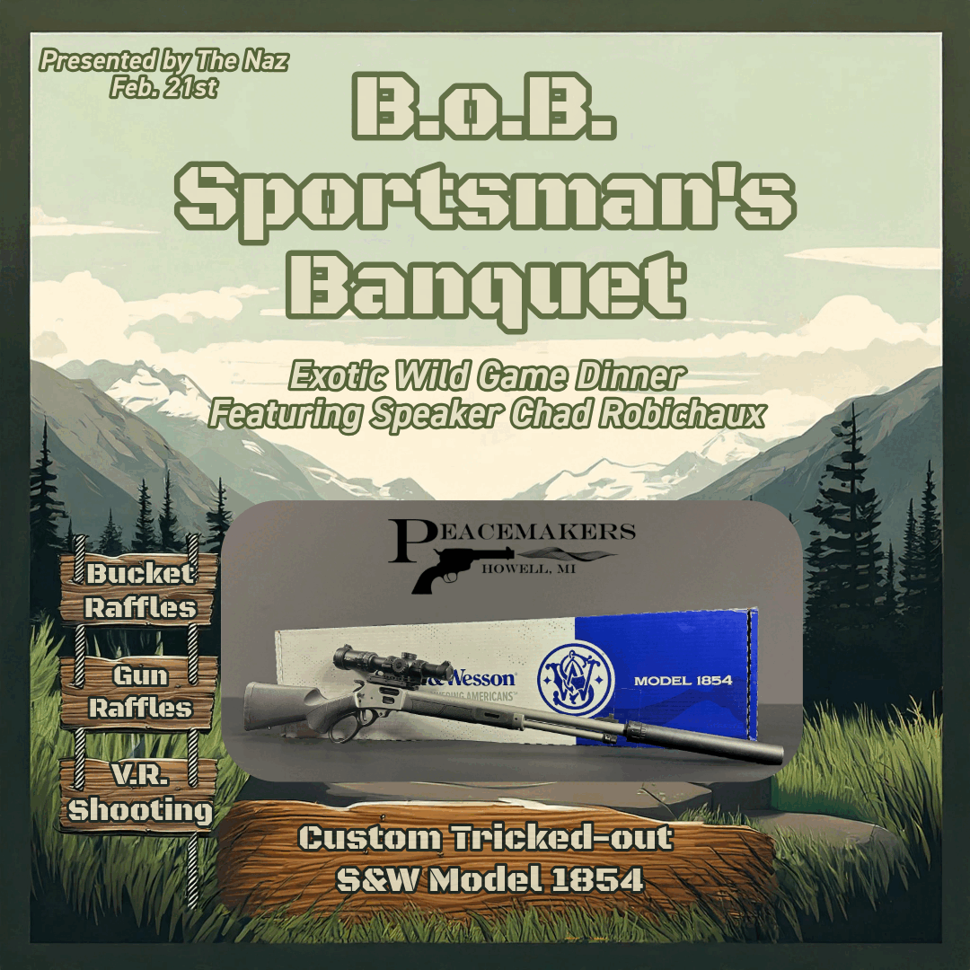 Peacemakers will bring 50+ guns for their gun raffle tables. New this year will be an additional, special raffle for a custom, decked-out Smith and Wesson 1854 SS Lever Actoin 44 with a 1-6 scope and suppressor.